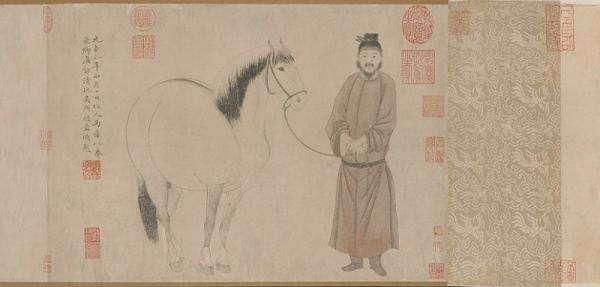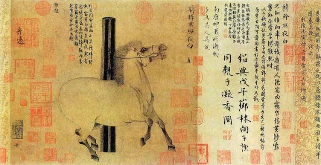 照夜白图 在唐末之际,中国的书画有了一次质的转变。人物画经过吴道子之后出现了巨大的变革,人物画开始注重墨法,“于小而多空隙之画面,表示集中性,丰盛之功绩(金原省吾《唐宋之绘画》)。 韩幹的《照夜白》画幅很小,但却着重表现战马的精神。“照夜白”是唐太宗昭陵六骏之一,是唐太宗最终爱的战马。在韩幹笔下,这匹战马“怒目圆睁,鼻翼煽张,四蹄腾骧,亢奋昂扬……好似‘龙’的化身”。 赵孟頫的《人马图》卷在《照夜白》画马的基础上,有所发展,以四分之三侧面的角度画马,较之前人更为真实。根据史料的记载,赵孟頫眼有疾病,因此他的画作多强调“古意”而不注重外形,将所画人物置于一种内心合理的结构中。《人马图》中的马,用两条近乎平行的弧线展示腹部和臀部,能够看出赵孟頫身后的书法功力。