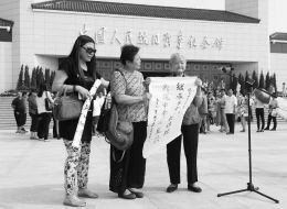![]() 在中国人民抗日战争纪念馆外,92岁的抗战老战士曹桂芬,向参加第十一届中国国际青少年书画大赛的孩子们赠送书法作品,上面书写着“继承革命光荣传统实现中华伟大复兴”16个大字(2015年8月5日摄)。