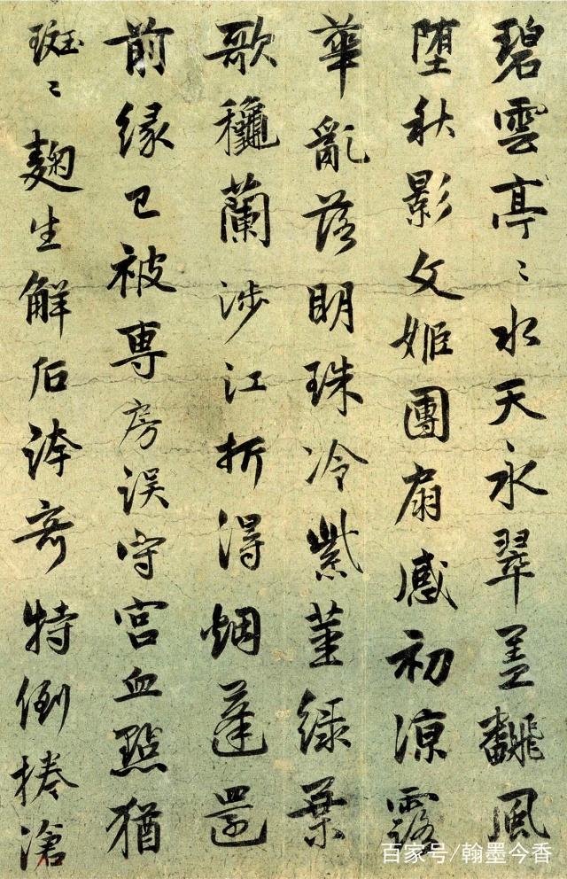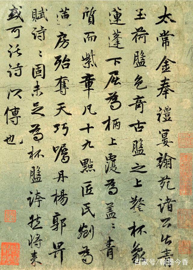 郭畀书学赵子昂,元初的时候形成了以赵氏为中心的“赵氏书家群”,除郭畀外还有钱良佑、朱德润、俞和等,这些人提倡魏晋之风,并且身体力行。而郭畀作为其中的佼佼者,更是得到赵氏的青睐,甚至曾帮赵子昂代笔书《松雪斋集》。此卷《青玉荷盘诗》是郭畀42岁左右时所书,正是成熟期。在赵派书家群中实属上乘之作,作品中结字用笔都酷似赵子昂,惟笔画挺拔利落而胜过赵氏。