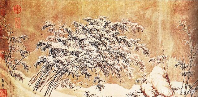 郭畀的绘画学习高克恭,主攻山水和林木,这幅《雪竹图》是他的代表作,现收藏于台北故宫博物院。图中千里茫茫的野外,大雪纷飞,由于雪的重压使得群竹倒向一边。背景空旷幽远,山坡高低起伏,墨色富有变化和层次感,虽是写竹但气势宏伟,不同一般。