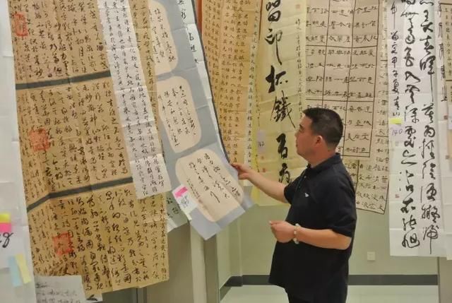 重庆某书法篆刻展评审现场 近数十年来,由于书坛某些富于理论远见的专家的阐扬,人们愈来愈看重书法于展览中效应,称之为“书法从书斋走向展厅”。此本无可厚非。中国书法经历了近3000年的书斋修炼之后,理应走向更为广阔、更为阳光的空间。 但同时,我们也须看到,放置在书斋里的作品与陈列于展厅里的作品,人们所投射的目光(或着眼点)是不同的——前者要精微,后者要广大甚至霸悍(这是国人最敬畏也最偏爱的一种品格)。 精微,则无关作品尺寸,耐看或有味便是;广大或霸悍,则要有一定的尺幅作保障,否则评委们可能不会多看一眼,更不会投来惊异的目光(这无怪评委,因为浩如烟海的来稿使他们无暇留意那些不起眼的作品)。这样,一些大型展览会上便产生这么一种现象,不论写得好与赖,作品要入选,首先尺幅要大,然而才是“形”与“神”的符合要求。