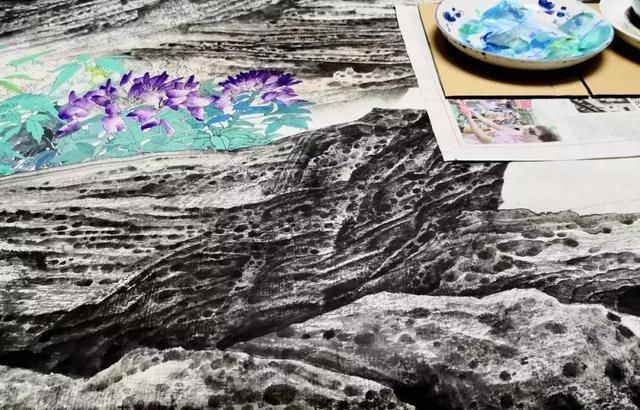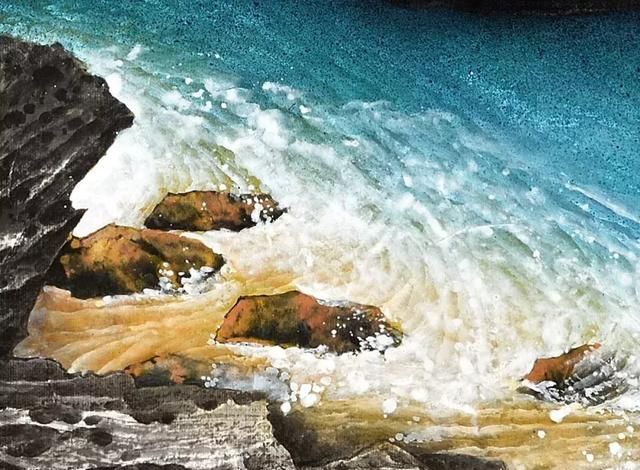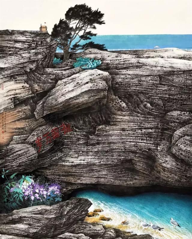 未君 《岁月•时光•年华》局部5 我无觅处可觅,无舟亦自横,崖高水阔,花落手心,荒凉之处自荒凉。是谁,在海之对岸,抚过我孤独深处的层层面纱。自恋的鸟儿,你总是在我掌灯之后,轻轻听我倾诉…… 我无法寥寥几笔写尽礁石之精神,也无法草草几笔画出海之灵魂。山之长,海之远,无思无虑,无欲无求,无雕无琢,水滴穿石,自可天成。 松树之高松树之强劲,让人魂牵梦萦,千山一叠,总在蝶树花开之时。信手画下一处礁石,只到是:正当年,花儿俏,窗里窗外几多情,落花自飘零,飞过桃源去。 岁月悠悠,时光流传,芬芳年华,虽万事修心,但初心不忘,仅此一处海岸线便可得知,一位年轻的诗人,他曾经来过。他也曾深情地问候您:国之百年,国之千年,国之万岁。只待鸿雁归来,那疏星淡月,万里河山,终归一处。 2019年7月4日