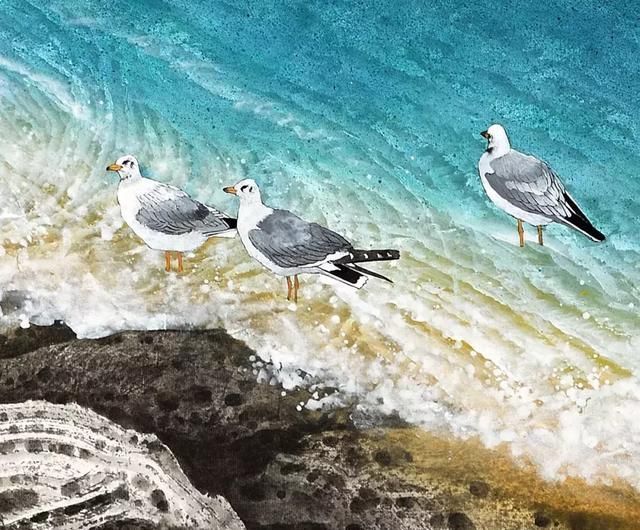 未君 《岁月•时光•年华》局部4 3 我一如少年般的懵懂,也如少年般的憧憬,时光如飞碟,旋起岁月蹉跎。岁月悠长,率真的鸟儿,或许不知人情冷暖,它悠闲地飞绕在海之上,盘旋许久,终究落下来,停留在能停留之处,我看你,你看它,它看潮涌不息。 时光从不刻薄,贤者有慧心,有慧心者便知善待时光。青春不再,年华不老,高处不胜寒,寒来有蝶化,化我之蝶,你可知艺术之羁绊。咫尺亦天涯,游离乃性情使然,只有洒脱无欲的境界和如大海一样宽广的胸怀,皆妙颜可赏,高品可近。