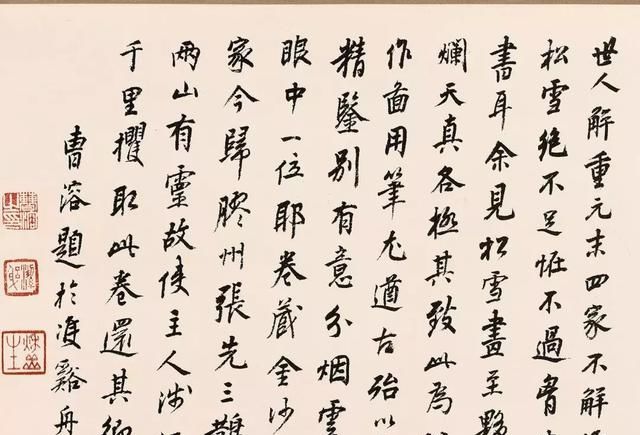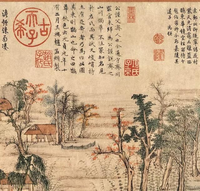 赵孟頫 书法 题款:公谨父,齐人也。余通守齐州,罢官来归,为公谨说齐之山川,独华不注最知名,见于左氏,而其状又峻峭特立,有足奇者,乃为作此图,其东则鹊山也。命之曰鹊华秋色云。元贞元年十有二月。吴兴赵孟频制。