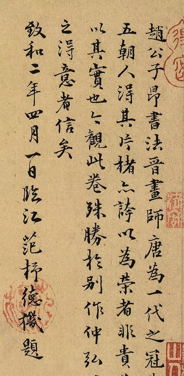 范杼题跋:赵公子昂,书法晋,画师唐,为一代之冠。荣际于五朝,人得其片楮,亦夸以为荣者,非贵其名而以其实也。今观此卷,殊胜于别作。仲弘所谓公之得意者,信矣。致和二年四月一日,临江范杼德机题。
